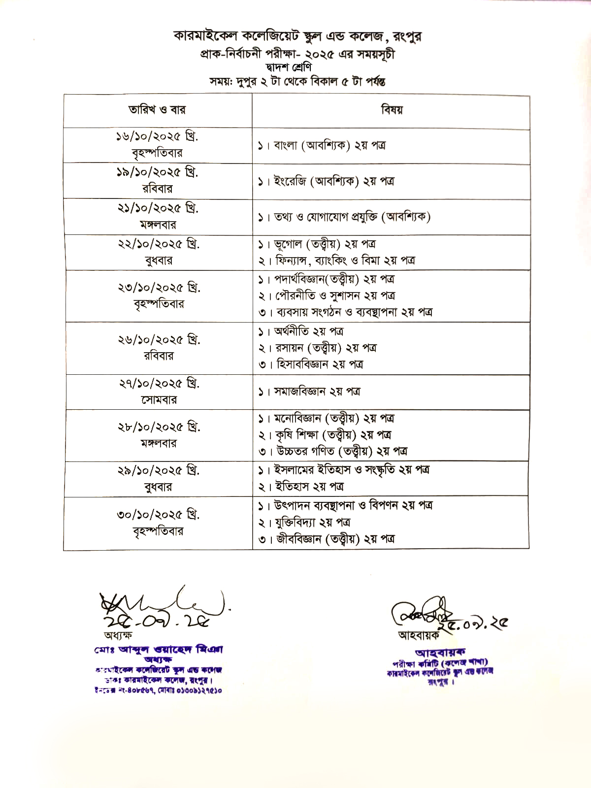 ২০২৫-২০২৬ শিক্ষাবর্ষে একাদশ শ্রেণিতে অধ্যয়নরত শিক্ষার্থীদের বিষয় ও গ্রুপ পরিবর্তন ( ২৪ ডিসেম্বর ২০২৫ থেকে ১৫ জানুয়ারি ২০২৬ পর্যন্ত), অধ্যক্ষ