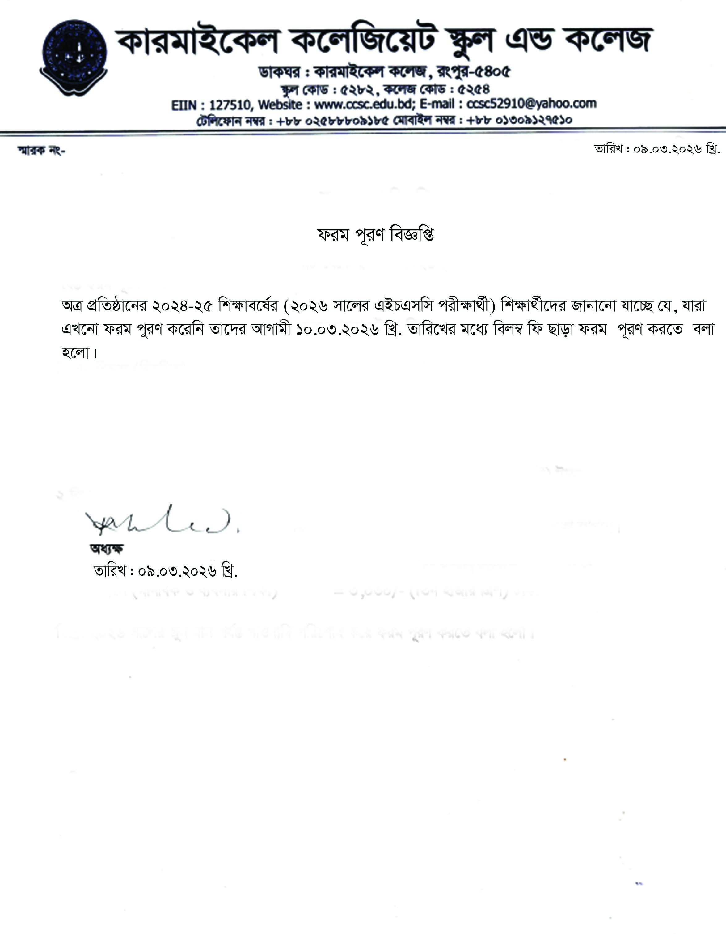 অত্র প্রতিষ্ঠানের ২০২৪-২৫ শিক্ষাবর্ষের (২০২৬ সালের এইচএসসি পরীক্ষার্থী) শিক্ষার্থীদের জানানো যাচ্ছে যে, যারা এখনো ফরম পূরণ করেনি তাদের আগামী ১০.০৩.২০২৬ খ্রি. তারিখের মধ্যে বিলম্ব ফি ছাড়া ফরম পূরণ করতে বলা হলো, অধ্যক্ষ